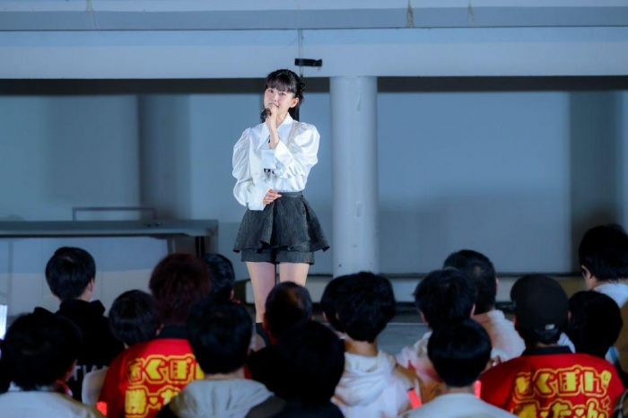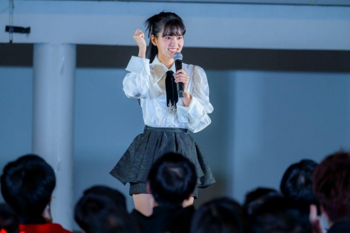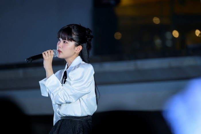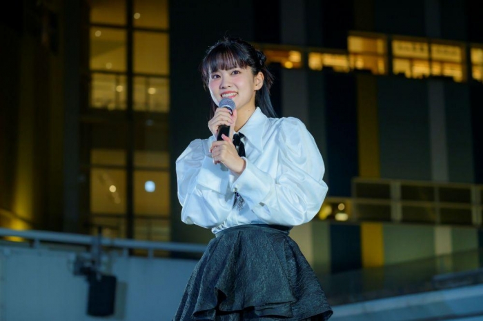 陽が沈み、辺りも暗くなった17時半。大西亜玖璃がステージに立つと、いつもより控えめな声援が送られる。というのも会場にデシベル制限があったからなのだが、彼女の普段のライブは、ファンの声がかなり大きいので、この日は、全体的に声のボリュームを抑えてのステージとなった。