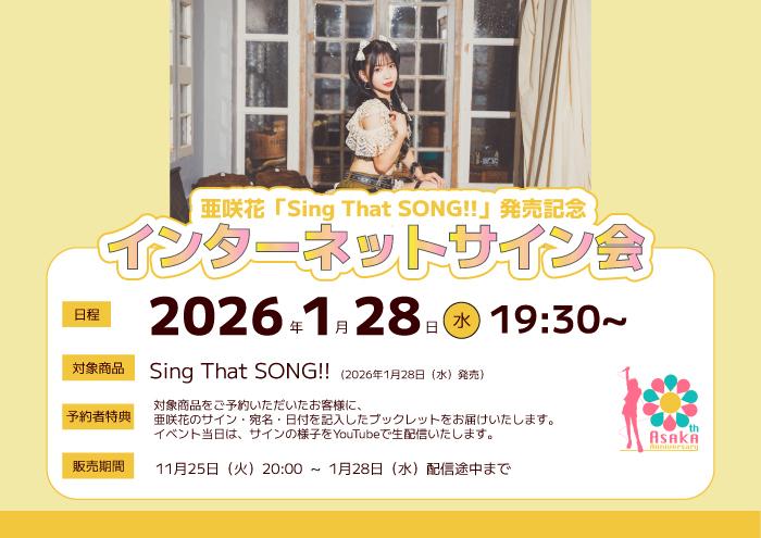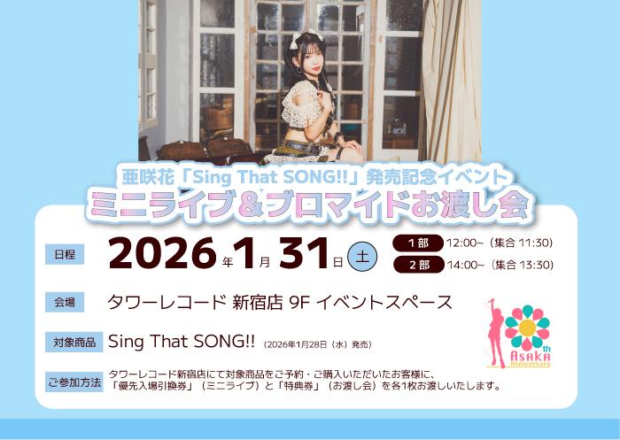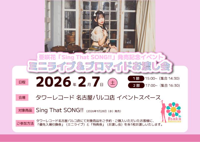 『Sing That SONG!!』の発売を記念したリリースイベントが決定。ネットサイン会や東京・名古屋でのミニライブなど、多彩な企画を実施します。対象商品<亜咲花『Sing That SONG!!』ATOM-0015>をご予約・ご購入でご参加いただけます。