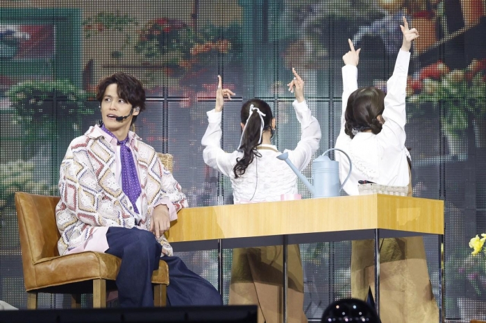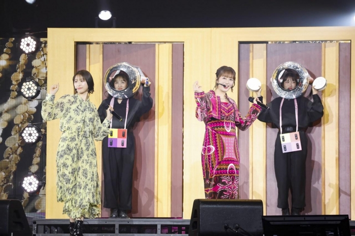 また、毎回絵になったり、花屋になったり、どうにかして企画に参加しようとする百田&高城は、今回は“最新の照明器具”として登場。ステージ照明を赤、黄、ピンク、紫に素早く切り替えたり、PRINCESS PRINCESSの「DIAMONDS」を歌う玉井&佐々木の後ろでタンバリンを叩いて盛り上げたり、照明器具以上の機能を見せつけた。