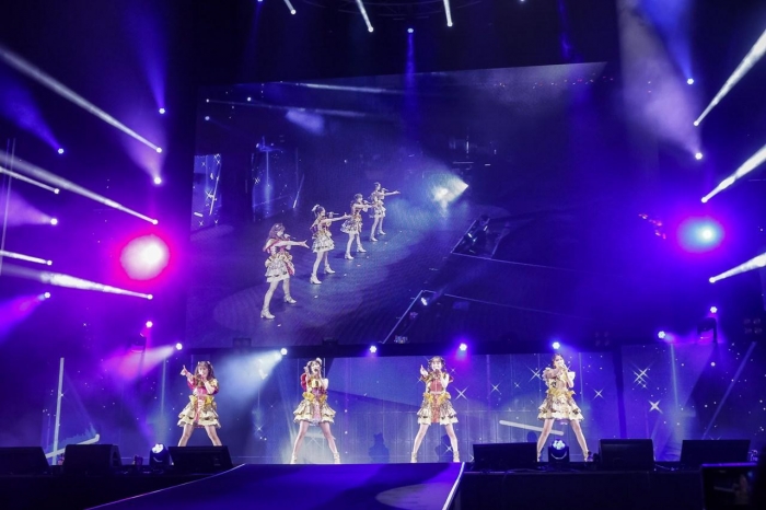 2日目、表公演のテーマは「光」。森の中で扉を見つけた少年少女たちが、扉の先の光に吸い込まれていったかと思えば、その光の中からももクロが登場。光をイメージしたゴールドの衣装に身を包み、昨年リリースしたアーケードカードゲーム『機動戦士ガンダム アーセナルベース FORSQUAD』の主題歌「Event Horizon」と、昨日に引き続き「境界のペンデュラム」を歌い、パワフルな歌声を会場に響かせた。