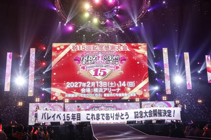 そんなトークをしていると、ステージ上に巨大な巻物が運ばれてくる。それを開くと、「15回記念大会開催決定」と次回の『バレイベ』が2027年2月13日(土)・14日(日)の2日間にわたって横浜アリーナにて開催されることが発表された。内容はまだ決まっていないが、『バレイベ』15周年を記念するイベントということで「盛大なことをやりましょう!」「みんな(リスナー)が見たいことをもう1度やるのはどう?」と案を膨らませたももクロの4人。そして「引き続き『ももクロくらぶxoxo』を聴いてくださいね!」と呼びかけて、期待を煽るような形で14回目の『バレイベ』の幕を下ろした。